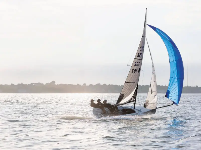 An optimally designed a-symmetrical sail plan, rig and planing hull shape create the boat’s “lift-off” power, while the flat stern section and chines and the ballasted lifting keel enhance the boat’s stability.